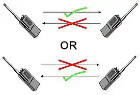 هذا هو أحد تعريفين متناقضين تم إقراره في معيار الاتحاد الدولي للاتصالات، لتفاصيل أكثر طالع اتصال مبسط - Simplex communication.