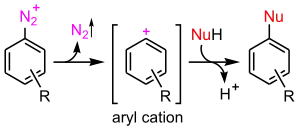 - آلية استبدال محب للنواة أحادي الجزيء SN1 المصادفة في أملاح الديازونيوم: