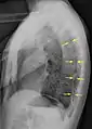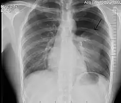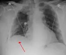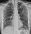 ![]() تبين الأشعة السينية للصدر وجود استرواح الصدر على اليمين (يسار الصورة)، حيث تبين أيضًا غياب علامات الرئة لوجود هواء حر داخل الصدر. A large right-sided spontaneous pneumothorax (left in the image). An arrow indicates the edge of the collapsed lung | |