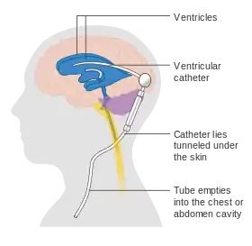 - في حالات وجود انسداد في طريق الدورة الطبيعية للسائل، فإن إيجاد مخرج لهذا السائل مهم جداً، وحيث أنه لا يمكن التدخل لعلاج الانسداد الموجود، فإن إيجاد مخرج آخر لتقليل الضغط داخل الدماغ مهم، حيث يقوم جراح الأعصاب بعمل توصيل بين بطينات المخ وتجويف القلب أو تجويف البطن لتصريف السائل فيما يعرف بالتَحْويلة الدماغِية (Cerebral shunt).[11]