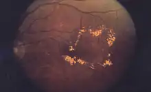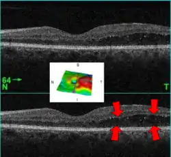 ![]() رجل في السادسة والستين من العمر يعاني من مرض السكري من النوع الثاني ,وتمثل هذه الصورة وذمة بقعية,تم تصويرها باستخدام جهاز التصوير الطبقي للتماسك البصري(الأسهم تشيرالى الوذمة).الصورة الموجودة في الوسط عبارة عن تمثيل ثلاثي الأبعاد سمك شبكية العين(الوذمة ملونة باللون الاحمر).). رجل في السادسة والستين من العمر يعاني من مرض السكري من النوع الثاني ,وتمثل هذه الصورة وذمة بقعية,تم تصويرها باستخدام جهاز التصوير الطبقي للتماسك البصري(الأسهم تشيرالى الوذمة).الصورة الموجودة في الوسط عبارة عن تمثيل ثلاثي الأبعاد سمك شبكية العين(الوذمة ملونة باللون الاحمر).). | |