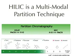 كانت كروماتوغرافيا التقسيم (التشارك أو التوزع) Partition chromatography أحد الأنواع الأولى للكروماتوغرافيا التي طورها الكيميائيون.[9] تم تطبيق مبدأ معامل التقسيم partition coefficient في كروماتوغرافيا الورق وكروماتوغرافيا الطبقة الرقيقة والطور الغازي وتطبيقات فصل سائل ــ سائل. حصل Archer John Porter Martin و Richard Laurence Millington Synge على جائزة نوبل في الكيمياء لعام 1952 لتطويرهما لهذه التقنية، والتي كانت تستخدم لفصل الأحماض الأمينية.[10] يستخدم كروماتوغرافيا التقسيم مذيبًا محتفظًا به، على السطح أو داخل حبيبات أو ألياف مصفوفة داعمة صلبة "خاملة" كما هو الحال مع كروماتوغرافيا الورق؛ أو يستفيد من بعض تأثيرات الكولومبية (الكهربائية الساكنة) و/ أو الهيدروجين مع الطور الثابت. تنقسم مكونات العينة بين الطور الثابت السائل والطور المتحرك eluent. تمامًا كما هو الحال في كروماتوغرافيا التفاعل المحبة للماء (HILIC ؛ تقنية فرعية داخل HPLC)، تفصل هذه الطريقة مكونات المزيج المراد تحليله بناءً على الاختلافات في قطبيتها. غالبًا ما يستخدم HILIC طورًا ثابتًا قطبيًا مرتبطًا وطورًا متحركًا مصنوعًا بشكل أساسي من الأسيتونيتريل مع الماء كمكون قوي. تم استخدام قسم HPLC تاريخيًا على دعامات السيليكا أو الألومينا غير المربوطة unbonded silica. يعمل كل منها بشكل فعال لفصل مكونات العينة المراد تحليلها عن طريق الاختلافات القطبية النسبية. تتميز الأطوار المرتبطة بـ HILIC بميزة فصل المواد المذابة الحمضية والقاعدية والمحايدة في مسار كروماتوغرافي واحد.[11]