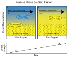 لا يجب أن يظل تكوين الطور المتحرك ثابتًا. يوصف الفصل الذي يتغير فيه تكوين الطور المتحرك أثناء عملية الفصل بأنه شطف متدرج. أحد الأمثلة هو التدرج اللوني الذي يبدأ عند 10٪ ميثانول وينتهي عند 90٪ ميثانول بعد 20 دقيقة. ويطلق على عنصري الطور المتحرك اسم "A" و "B" ؛ A هو المذيب "الضعيف" الذي يسمح للمذاب (المادة المنحلة) بالتخلص ببطء فقط، بينما B هو المذيب "القوي" الذي يزيل المواد المذابة بسرعة من العمود. في كروماتوغرافيا الطور العكسي، غالبًا ما يكون المذيب A عبارة عن ماء أو محلول مائي ، بينما B عبارة عن مذيب عضوي قابل للامتزاج بالماء، مثل الأسيتونتريل أو الميثانول أو رباعي هيدرو الفوران THF أو الأيزوبروبانول.