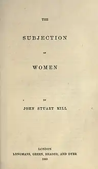 - Mill, John Stuart (1869). The Subjection of Women (الطبعة 1869 first). London: Longmans, Green, Reader & Dyer. مؤرشف من الأصل في 9 أغسطس 2016. اطلع عليه بتاريخ 10 ديسمبر 2012. الوسيط