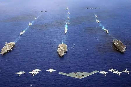 أتاحت "الحرب ضد الإرهاب" للولايات المتحدة الأمريكية إقامة مجموعة قواعد عسكرية في آسيا الوسطى- وهي منطقة جديدة بالنسبة لها، وإرسال قواتها من جديد إلى الفليبين التي ُسحبت منها خلال سنوات 1990. ليس الحفاظ على السيطرة العسكرية الأمريكية الهدف الوحيد للاستراتيجية الكبيرة لإدارة بوش. إنها تسعى أيضا إلى فرض النموذج الانجلو-أمريكي من الرأسمالية اللبرالية على العالم برمته. يؤكد بوش في تقديمه لوثيقة الاستراتيجية القومية للأمن:" انتهت الصراعات الكبرى للقرن العشرين بين الحرية والتوتاليتارية بنصر حاسم لقوى الحرية وبنموذج مستديم وحيد لنجاح أمة: الحرية والديمقراطية والسوق الحرة." إنه بالفعل نمط خاص جدا من النزعة الأممية التي تترك للشعوب حرية اختيار "النموذج الوحيد المستديم"، الرأسمالية الليبرالية. بعد أحداث 11 سبتمبر 2001 قررت أمريكا اجتياح أفغانستان لإسقاط حكم طالبان ومطاردة بن لادن ضمن عملية كبيرة استهدفت القضاء على ما سمته بالإرهاب. أسفرت عن قتل ما يزيد عن خمسة آلاف شخص وتشريد وتجويع ملايين الأفغان لينتقلوا من وضع سيئ لوضع أكثر سوءاً.