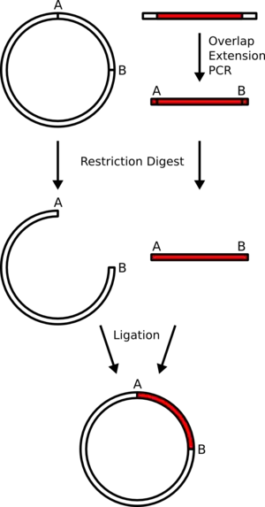 وهنا يتسم كلٌ من منتج تفاعل البوليميراز المتسلل (PCR) المحتوي على المورث الثديي مع مواقع الاقتطاع الجديدة وبلازميد الوجهة المتسهدفة بأنهما عرضةٌ لهضم الاقتطاع، وأن منتجات الهضم يتم تنقيتها بواسطة استخدام الفصل الكهربائي للهلام.
