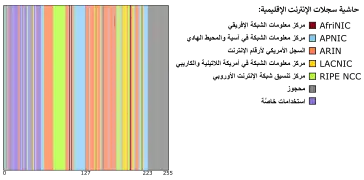 طيف الفضاء المُحصص لعناوين الإصدار الرابع من بروتوكول الإنترنت، تمثّل الألوان سجلات الإنترنت الإقليمية الخمسة.