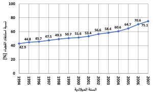النسبة المئوية لفضاء الإصدار الرابع من بروتوكول الإنترنت المستنفد (مُحصص من أيانا إلى سجلات الإنترنت الإقليمية أو المستخدمين) في الفترة بين العامين 1994 و 2007م. الأرقام تمثل نسبة الاستنفاد في اليوم الأول من كل سنة.