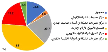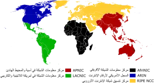 2. هناك 5 سجلات إنترنت إقليمية في العالم هي: مركز معلومات الشبكة الإفريقي (AfriNIC) ومركز معلومات الشبكة في آسية والمحيط الهادي (APNIC)، والسجل الأمريكي لأرقام الإنترنت (ARIN)، ومركز معلومات الشبكة في أمريكا اللاتينية والكاريبي (LACNIC)، ومركز تنسيق شبكة الإنترنت الأوروبي (RIPE NCC).[66]