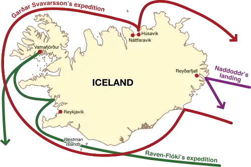 يذكر كتاب إيسلندينغبوك أن أول شمالي وطئت قدميه التراب الآيسلندي كان أحد الفايكنغ يدعى نادودر . و بقي نادودر لفترة قصيرة من الزمن؛ لكنه أعطى اسماً للبلد: Snæland (أرض الثلج). ثم تبعه السويدي غارذار سفافارسون، الذي كان أول من بقي طوال فصل الشتاء. في فترةٍ ما حوالي 860م، دفعت عاصفة قاربه بعيداً نحو الشمال حتى وصل الساحل الشرقي لآيسلندا.اقترب غارذار من الجزيرة من الشرق، وأبحر غرباً على طول الساحل ثم إلى الشمال، وبنى بيتاً في هوسافيك. أكمل دورةً كاملة مبحراً حول الجزيرة مستكشفاً للتحقق إن كانت جزيرة فعلاً. و غادر في الصيف التالي، ولم يعد أبداً؛ ولكن ليس قبل أن يعطي الجزيرة اسماً: (Garðarshólmur غارذارسهولمور)و التي تعني حرفياً جزيرة غارذار. قرر أحد رجاله ويدعى ناتفاري البقاء مع عبدين. أقام ناتفاري في ما يعرف الآن بـ(ناتفاريفيك)، بالقرب من سكيالفاندي. يؤكد لاندنامابوك أن ناتفاري لم يكن مستوطناً دائماً.