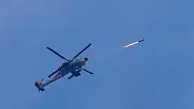 ![]() إيه إتش-64 أباتشي لحظة إطلاقها صاروخا من قاذفة الصواريخ. | |||||||