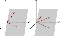 في مستو ثلاثي الأبعاد، تحدد متجهتان مستقلتان خطيا لهما نفس نقطة المبدأ مستويا من خلال تلك النقطة. ضربهما الاتجاهي هو متجهة ناظمة لذلك المستو، وأي متجهة عمودية مع هذا الضرب الاتجاهي عبر نقطة المبدأ تقع في نفس المستو.[1] هذا يقود إلى اختبار تشارك المستوى التالي باستخدام جداء ثلاثي غير متجه:
