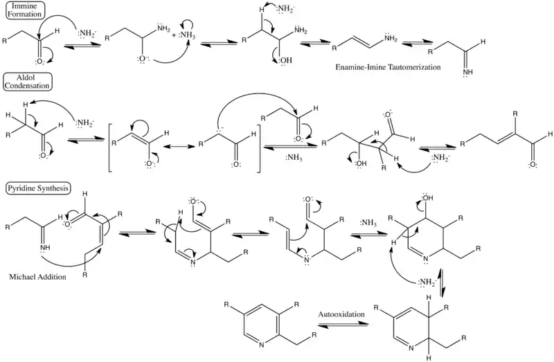 - Chichibabin, A. E. (1924). "Über Kondensation der Aldehyde mit Ammoniak zu Pyridinebasen" [On condensation of aldehydes with ammonia to make pyridines]. Journal für Praktische Chemie. 107: 122. doi:10.1002/prac.19241070110. مؤرشف من الأصل في 20 سبتمبر 2018. الوسيط
