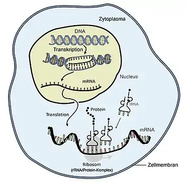 التخليق الحيوي للبروتين أو الاصطناع الحيوي البروتين (بالإنجليزية: Protein biosynthesis (Synthesis)) هي العملية الحيوية التي تقوم بها الخلية بتصنيع السلاسل الببتيدية ووصلها مع بعضها لتشكيل البروتينات اعتبارا من الحموض الأمينية.[1] يستخدم المصطلح أحيانا للإشارة فقط إلى عملية ترجمة البروتينات لكنها غالبا تستخدم للإشارة لكامل عملية تصنيع البروتينات بدءا من تخليق الحموض الأمينية والنسخ من ثم الترجمة الجينية للرنا المرسال إلى عملية تشكيل الببتيدات وربطها لتصبح بروتينا معينا. فمثلا يتكون الإنسولين من 51 من الأحماض الأمينية ، بأنواع معينة من الاحماض الأمينية وبتتابع معين ؛ الإنسولين هو الهرمون الذي يصطحب الجلوكوز في الدم ويوصله إلى الخلايا ، حيث يشتبك مع الخلية ويحثها على فتح جدارها لإدخال جزيء الجلوكوز ، فتفتح الخلية وتأذن للجلوكوز السكر بالدخول ويحدث في الخلية أيض الجلوكوز. وبالرغم من التشابهات في عملية تخليق البروتين بين كافة الكائنات إلا أننا نجد بعض الفوارق والاختلافات بين حقيقيات النوى وطلائعيات النوى.