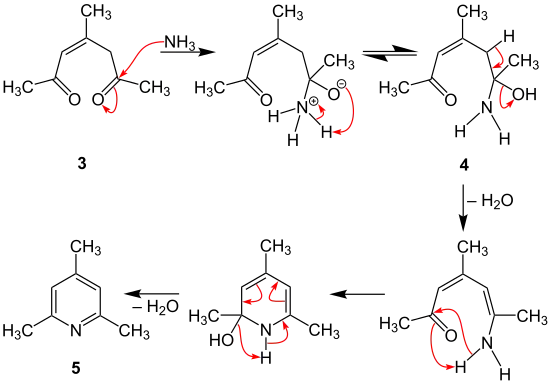 ما يلي وصف تفصيلي لآلية تفاعل تحضير مشتق البيريدين: 6،4،2-ثلاثي ميثيل البيريدين: [3][4] [5]