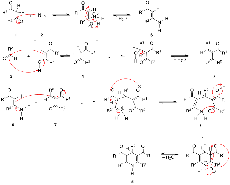 إن اصطناع هانتش للبيريدين عبارة عن تفاعل متعدد المكونات بين ألدهيد، مثل فورمالدهيد، مع مكافئين من حمض كيتو (β-كيتو إستر) مثل إيثيل أسيتو أسيتات، مع وجود مانح لذرة النتروجين مثل خلات الأمونيوم أو الأمونياك.[3]
