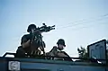 Sharpshooter, with weapon trained, atop a SWAT vehicle