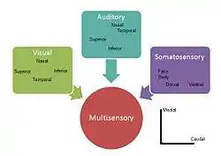 ![]() Example of how visual, auditory and somatosensory information merge into multisensory integration representation in the superior colliculus Example of how visual, auditory and somatosensory information merge into multisensory integration representation in the superior colliculus | |