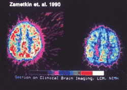 زامتكين وأخرين(1990) اليسار: نشاط المخ في أشخاص أصحاء. اليمين: نقص واضح في نشاط المخ في الأشخاص المصابين باضطراب نقص الانتباه مع فرط النشاط.