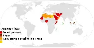 تجّرم أغلب الدول الإسلاميّة التحول من الإسلام إلى الدين آخر. ويواجه العديد من معتنقو المسيحية ذووي الخلفية الإسلامية نبذ اجتماعي أو السجن وأحيانًا القتل وذلك على خلفية تحولهم للمسيحية.[174]