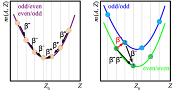 المتكاتلات الغنيات بالنيوترونات تضمحل بإشعاع بيتا السالب (نيوترون يتحول إلى بروتون وضديد نيوترينو) وهي الأنوية التي تكون على الجانب الأيسر من القطع المكافيء وصولا إلى أسفل المنحنى، في حين تضمحل الأنوية الأغنى بالبروتونات (تلك اللائي يقعن على الجهة اليمنى من القطع) بإشعاع بيتا الموجب (إطلاق البوزيترون وهو إلكترون موجب الشحنة) وجسيم النيوترينو، أو بالتقاط إلكترون من المدار الذري الأول. المتكاتلات الزوجية (ذوات العدد الكتلي زوجي) قد تحوي عددا زوجيا من البروتونات وزوجيا من النيوترونات أو عددين فرديين بحيث يكون المجموع عدد زوجي. ينتج عن ذلك وجود قطعين مكافئين يعلو القطع ذو الأعداد الفردية ذلك الاخر ذو الأعداد الزوجية، ما يجعل مسار عملية الإشعاع على القطع من الأعلى إلى الأسفل متعرجا.