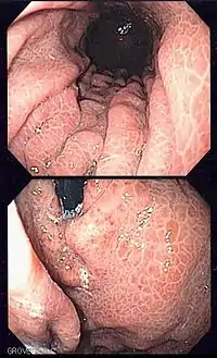 ![]() صورة تنظيرية لاعتلال المعدة التالي لارتفاع توتر وريد الباب. حيث يصبح الغشاء المخاطي الأملس للمعدة شبيه بالفسيفساء أو كـ "جلد الثعبان". صورة تنظيرية لاعتلال المعدة التالي لارتفاع توتر وريد الباب. حيث يصبح الغشاء المخاطي الأملس للمعدة شبيه بالفسيفساء أو كـ "جلد الثعبان". | |