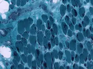 خزعة عضلية (تلوين ثلاثي الألوان) تظهر فيها أشكال خيطية (في الصورة، باللون الأزرق السوداوي الغامق) في الخلايا العضلية، وهو ما يميز الاعتلال العضلي الخيطي