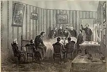 ![]() اغتيال الرئيس أبراهام لينكون من اليمين إلى اليسار: جون ويلكس بوث، أبراهام لينكون، ماري تود لينكون، كلارا هارس، هنري راثبون | ||||