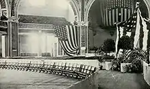 مناسبًا جدًا لهذا الغرض حيث كانت قاعة الاحتفالات الكبيرة بالقرب من المتنزه، وكانت وسط المعرض وبها مدخل في كل جانب من الجوانب الأربعة للقاعة. وبالإضافة إلى وجود العديد من صفوف المقاعد بالصالة، كانت صالات العرض واسعة وفسيحة. وقضى بابكوك صباح يوم السادس من سبتمبر في تجهيزالترتيبات المادية للاستقبال؛ اُزيلت المقاعد لعمل ممر واسع يبدأ من البوبات الموجودة بالجهة الشرقية التي سيقف بها الجمهور وممتدة إلى المكان الذي سيقف فيه ماكينلي لإلقاء خطابه. وبمجرد أن يبدأ بعض الجماهير بمصافحة ماكينلي، ستستمر الجماهير في الخروج من المبنى. كان العلم الأميريكي منصوب خلف ماكينلي، وذلك لستره من الخلف وأيضا كنوع من الزينة _ كما وضُعت أصص النبات حول مكان وقوف الرئيس لخلق مشهد جذاب. فإلى جانب فوائد هذا المبنى واستخدامه في أغراض آخرى، فيعتبر هذا المبنى المزخرف أحد المعالم المعمارية للمعرض.[37]