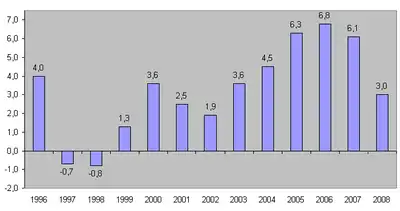 ومع ذلك، ومصدر كبير، كان الاقتصاد حساسية لانخفاض الطلب في ألمانيا والشركاء التجاريين الآخرين. في منتصف عام 2009، وقدر الانخفاض السنوي من الناتج المحلي الإجمالي لعام 2009 نحو 3٪ أو 4.3٪,[1] انخفاضا متواضعا نسبيا. ربما كان لهذا تأثير الأزمة الاقتصادية محدودة بسبب وجود عملة وطنية أن تضعف مؤقتا في عام 2009 H1، وتبسيط الحياة من المصدرين.