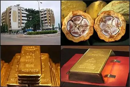 غانا هي ثاني أكبر منتج للذهب في إفريقيا (بعد جنوب إفريقيا) وثاني أكبر منتج للكاكاو (بعد كوت ديفوار).[10] كما أنها غنية بالماس وخام المنغنيز والبوكسيت والزيت. وقد تم إلغاء معظم ديونها في عام 2005 ولكن سُمح للإنفاق الحكومي في وقت لاحق بالتضخم. إلى جانب انخفاض أسعار النفط أدى ذلك إلى أزمة اقتصادية أجبرت الحكومة على التفاوض بشأن تسهيل ائتماني ممتد بقيمة 920 مليون دولار من صندوق النقد الدولي في أبريل 2015.[11]