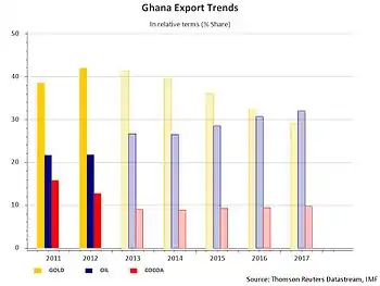 |CitationClass=تم تجاهله (مساعدة) - OEC. "Ghana Imports and Exports". Atlas Media. مؤرشف من الأصل في 13 أكتوبر 2017. اطلع عليه بتاريخ 13 مايو 2016. الوسيط