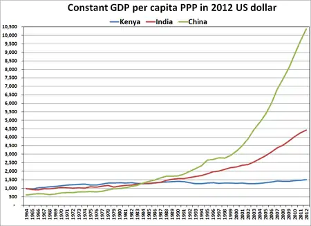 استعادت كينيا استقلالها في عام 1963. في عهد الرئيس جومو كينياتا، عززت الحكومة الكينية "أفرقة" الاقتصاد الكيني، [13] مما أدى إلى تحقيق نمو اقتصادي سريع من خلال الاستثمار العام، وتشجيع الإنتاج الزراعي لأصحاب الملكيات الصغيرة، وحوافز للاستثمار الصناعي الخاص، والأجنبي في كثير من الأحيان. شددت ورقة جلسة مؤثرة كتبها توم مبويا ومواي كيباكي في عام 1965 على حاجة كينيا إلى تجنب كل من الاقتصاد الرأسمالي في الغرب والشيوعية في الشرق. جادلت الورقة بأن كينيا يجب أن تركز بدلاً من ذلك على الاشتراكية الأفريقية، مع تجنب ربط ثروات كينيا الاقتصادية بأي دولة أو مجموعة من البلدان.[14] من عام 1963 إلى عام 1973 نما الناتج المحلي الإجمالي بمعدل سنوي متوسط قدره 6.6 ٪، وخلال السبعينيات نما بمعدل متوسط قدره 7.2 ٪. نما الإنتاج الزراعي بنسبة 4.7٪ سنوياً خلال نفس الفترة، مدفوعاً بإعادة توزيع العقارات، وتوزيع سلالات جديدة من المحاصيل، وفتح مناطق جديدة للزراعة. ومع ذلك، انخفض معدل نمو الناتج المحلي الإجمالي إلى 4.2٪ سنويًا في الثمانينيات، و2.2٪ سنويًا في التسعينيات.[15]