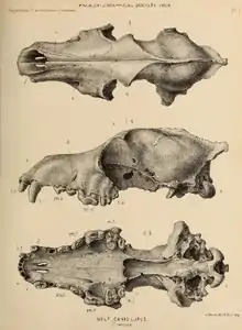 ![]() British Pleistocene Mammalia (1866) Wolf Cranium | توماس نورثمور وجون ماكينري وليام بينجيلي | 1824 | كهوف كينتس، ديفون، إنجلترا | |