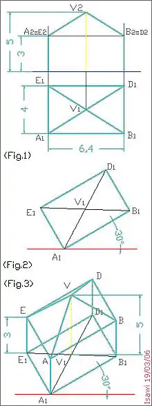 - من المسقط الأول V1 (كما هو مبين في الرسم:fig.3) لرأس الهرم R نرسم خط رأسي مستقيم الذي يمثل محور الهرم؛