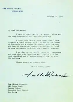 - Einstein to Roosevelt, August 2, 1939 نسخة محفوظة 14 أغسطس 2019 على موقع واي باك مشين.