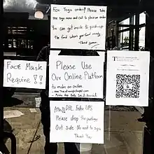اثرت الجائحة كذلك على تجارة المطاعم ففي بداية مارس/آذار 2020 أعلنت بعض المدن الكبرى في الولايات المتحدة أن الحانات والمطاعم ستمنع تناول الطعام داخل المطعم وتقتصرها إلى طلبات الاستلام والتوصيل، وفي نهاية الشهر فرضت العديد من الولايات قيودًا تلزم المطاعم أن تقتصر على خدمتي طلبات الاستلام والتوصيل فقط، وقد فُصل بعض الموظفين وكان عدد الموظفين الذين يفتقرون إلى الاجازات المرضية في هذا القطاع أكبر مقارنةً بالقطاعات المماثلة، ونتيجة لاقتصار الخدمات إلى خدمتي طلبات الاستلام والتوصيل تم تسريح معظم الخوادم والسقاة مما دفعهم إلى إنشاء " وعاء افتراضي للبقشيش" عبر 23 مدينة أمريكية، وفي أواخر شهر مارس/آذار بدأت مبادرة في الولايات المتحدة تسمى " Great American Takeout " تدعو الناس الذين في الحجر المنزلي لدعم المطاعم المحلية كل يوم ثلاثاء عن طريق خدمة الاستلام خارج المحل أو بإستخدام خدمات توصيل الطعام.