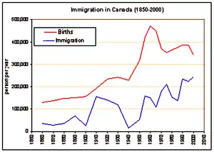 يشير برنامج الهجرة بكندا (أكتوبر 2004) إلى أن كندا بها أعلى معدل للهجرة لكل فرد في العالم،[3] رغم أن إحصائيات كتاب حقائق العالم الصادر عن وكالة المخابرات الأمريكية (CIA) يوضح أن هذا المعدل يزيد في عدد من الدول المدن والجزر الصغيرة، فضلاً عن بعض الدول الكبيرة في المناطق التي تضم لاجئين.[4] ولقد استقبلت كندا، في عام 2004، حوالي 235824 مهاجرًا.[5] تتميز كندا، كذلك، عن غيرها من دول الغرب بدعمها واسع النطاق لمعدلات الهجرة المرتفعة، وهو الدعم الذي شهد زيادة في السنوات الأخيرة.[6] وجميع الأحزاب السياسية الرئيسية في كندا تدعم إما الحفاظ على المستوى الحالي للهجرة أو زيادته. ورغم أن الحكومة الكندية السابقة المتمثلة في حزب الإصلاح كانت تبدي مخاوفها بشأن الهجرة[7]، فإن الحكومة الحالية المحافظة لا تخطط مطلقًا لخفض مستويات الهجرة. فعند إعلان رئيس الوزراء الكندي، ستيفن هاربر عن التغييرات التي تمت في قانون الهجرة، طمأن الكنديين قائلاً: "أريد أن أوضح بوجه عام فيما يتعلق بالهجرة أن الحكومة تتبنى سياسة داعمة بقوة للهجرة. فنحن نعمل على زيادة عدد المهاجرين أكثر من أية حكومة سابقة."[8] ولقد كانت الحكومة الليبرالية السابقة أكثر دعمًا لارتفاع معدلات الهجرة، إذ اقترحت زيادة هذه المعدلات بنحو 20000 فرد في العام.[9] وتُبرَر هذه السياسة عادةً بالحُجج الاقتصادية. على سبيل المثال، أشار رئيس الوزراء السابق، بول مارتن، إلى ضرورة زيادة معدلات الهجرة لسد العجز في الأيدي العاملة الماهرة، وتعويض أعداد السكان المسنين.[10]