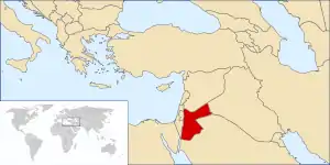 الأردن أو (رسمياً: المملكة الأردنية الهاشمية)[21] هي دولة عربية تقع في جنوب غرب آسيا، تتوسط الشرق الأوسط بوقوعها في الجزء الجنوبي من منطقة بلاد الشام، والشمالي لمنطقة شبه الجزيرة العربية.[22][23] لها حدود مشتركة مع كل من سوريا من الشمال، فلسطين من الغرب،[24] العراق من الشرق، وتحدها شرقًا وجنوبًا المملكة العربية السعودية، كما تطل على خليج العقبة في الجنوب الغربي، حيث تطل مدينة العقبة على البحر الأحمر، ويعتبر هذا المنفذ البحري الوحيد للأردن. سميت بالأردن نسبة إلى نهر الأردن الذي يمر على حدودها الغربية.[25][26]