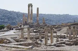 كانت عمون أو ربة عمون المعروفة الآن بعمان عاصمة للدولة العمونية، وكان العمونيون يتمركزون في شمال ووسط الأردن وتحتفظ عمان بموقع العاصمة القديمة. أسس العمونيون دولتهم حوالي سنة 1250 ق.م، وعاشوا حياة البداوة وكونوا دولة قوية امتدت حدودها من الموجب جنوباً إلى سيل الزرقاء شمالاً ومن الصحراء شرقاً إلى نهر الأردن غرباً. وبحكم موقع عمان الجغرافي الاستراتيجي طمع فيها الغزاة فتعرضت مملكة العمونيين للغزو والدمار لكنها كانت تضمد جراحها وتعيد بناء مدنها. وكان "طوبيا العموني" آخر ملك حكم دولة العمونيين وارتبط اسمه بآثار عراق الأمير وقصر العبد في وادي السير. بالنسبة لمنطقة عمان فقد كانت معمورة في العصر الحديدي (1200 ق.م-330 ق.م) وتميزت هذه الفترة باستخدام العجلة لصناعة الفخار، وفي هذا العصر شهدت المنطقة تطورا في استخدام الحديد في صناعة الأسلحة والأدوات المنزلية. وبرز جبل القلعة في عمان مقر عاصمة العمونيين. وما زالت بقايا قصور العمونيين ماثلة في جبل القلعة، منها جدران الأسوار، والآبار المحفورة في الصخر الجيري. كما عُثر في جبل القلعة على أربعة تماثيل لملوك العمونيين تعود إلى القرن الثامن ق.م، ووجدت تماثيل أخرى في ضواحي عمان في خربة الحجاز وأبو علندا وعرجان.[56] بعد سقوط العاصمة الآشورية نينوى، ثارت جميع الشعوب التي كانت تخضع للآشوريين، ففر آخر ملوك آشور (أباليت) إلى حران، وأصبحت السيطرة للبابليين بعد الآشوريين الذي سرعان ما حاولوا الاستحواذ على شرقي المتوسط ومنها شرقي الأردن، فتآلف ملوك مؤاب وعمون وصور وصيدا لصد هجمات بابل، إلا أن الملك البابلي نبوخذ نصر تمكن من الانتصار عليهم والوصول إلى القدس سنة 586 ق م، ثم تمكن من إخضاع صيدا ومؤاب وعمون، فيما بقي محاصرا صور لمدة ثلاث عشرة سنة، إلى أن أخضعها. وقد سبى نبوخذ نصر عددًا كبيرًا من اليهود من القدس وفلسطين إلى بابل، إلا أن بابل ما لبثت أن سقطت في أيدي الفرس سنة 540 ق م. وبقيت الأردن تحت حكم الفرس إلى أن جاء الإسكندر الأكبر عام 333 ق م، وأنتصر على داريوس ملك الفرس وبسط النفوذ اليوناني على الأردن والبلدان المجاورة. بعد وفاة الإسكندر انقسمت الإمبراطورية اليونانية إلى ثلاثة أجزاء: فكانت مصر من نصيب البطالمة، أما بلاد الشام فكانت من نصيب السلوقيين، إلا أن بطليموس تمكن عام 312 ق م من ضم جنوبي بلاد الشام أي الأردن وفلسطين لتصبح جزءا من دولة البطالمة الذين يتمركزون في مصر، [57][58] حيث أولاها اليونانيون أهمية كبرى، إذ صارت من ممتلكات بطليموس المصري، حيث أعيد بناؤها، وأطلقوا اسماً جديداً عليها وهو: فيلادلفيا بدلاً من ربة عمون. بقي اليونانيون في عمان مدة تقارب مائة عام بعد هذا الاحتلال حتى طردهم منها الأنباط التي نشات مملكتهم بعد استيلائهم على دولة الأدوميين، حيث وصلت حدود مملكة الأنباط من خليج العقبة إلى نهر اليرموك ومن وادي السرحان في البادية شرقاً إلى نهر الأردن وغور الأردن غرباً.