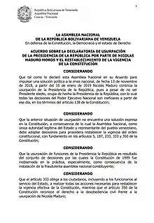 بعد خطاب غوايدو أصدرت الجمعية الوطنية في البداية بيانًا صحفيًا قال فيه أن غوايدو قد تولى منصب الرئيس بالإنابة. حل بيان لاحق محل هذا الموقف وتم توضيح موقف غوايدو بأنه "على استعداد لتولي القيادة لكنه قال أن هذا ممكن فقط بمساعدة الفنزويليين".[88] لم يكن هذا الاقتراح بمثابة انقلاب من قبل المعارضة على أساس "عدم شرعية" مادورو المعترف بها من قبل العديد من الحكومات والعمليات الدستورية التي تتبعها الجمعية الوطنية.[89] على وجه التحديد استعملوا المواد 233 و 333 و 350. في هذا اليوم تلقى غوايدو رسالة من رئيس محكمة العدل العليا في فنزويلا في المنفى ومقرها في بنما وطلب منه أن يصبح رئيسا لفنزويلا بالنيابة.[90]