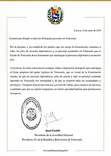|CitationClass=تم تجاهله (مساعدة) - "Venezuelan Official Threatens to Cut Power to U.S. Embassy as Diplomatic Standoff Grows". TIME. مؤرشف من الأصل في 22 مارس 2019. اطلع عليه بتاريخ 24 يناير 2019. الوسيط
