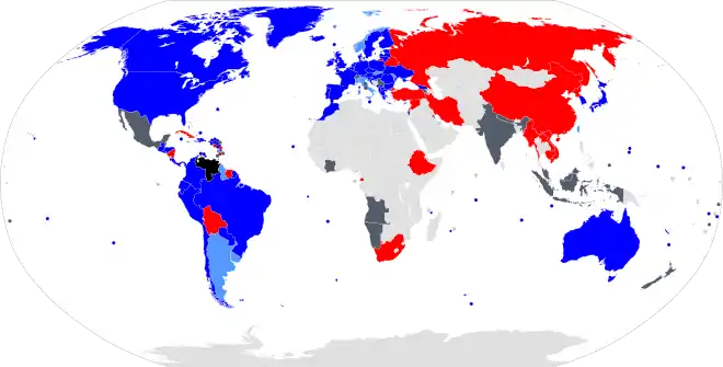 انضمت عدة بلدان ومنظمات حكومية دولية إلى الجمعية الوطنية في رفض شرعية احتفاظ مادورو بالسلطة واستدعت 14 دولة سفرائها احتجاجًا[134] وقطعت الباراغواي العلاقات الدبلوماسية مع فنزويلا ودعت دول أخرى مادورو إلى التنحي أو الإقالة.[73][74][86][135] دعم آخرون مثل التحالف البوليفاري لشعوب أمريكتنا وجنوب أفريقيا[136] مادورو بدعوة المعارضة لقبول إعادة انتخابه وحضور مراسم أداء اليمين.[82][137]