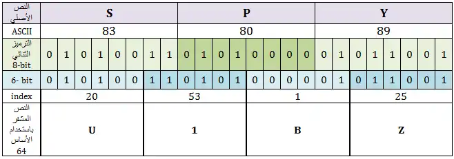 إذا أردنا ترميز كلمة "SPY" فترميز أسكي المقابل لها هو 83-80-89 وبالترميز الثنائي باستخدام 8 بت (0101001101010 00001011001) أي أن لدينا سلسلة من 24 بت يمكن تقسيمها إلى مجموعات من 6بت، لنحصل على الأرقام (20-53-1-25) وبالعودة إلى الجدول في الأسفل تصبح الكلمة بعد الترميز (U1BZ).
