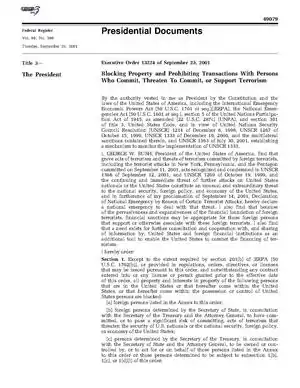 |CitationClass=تم تجاهله (مساعدة) - Office of the Press Secretary (September 23, 2001). "Presidential Executive Order on Terrorist Financing: Blocking Property and Prohibiting Transactions With Persons Who Commit, Threaten to Commit, or Support Terrorism". whitehouse.gov. واشنطن العاصمة: البيت الأبيض. مؤرشف من الأصل في 8 أغسطس 2018. اطلع عليه بتاريخ 29 أكتوبر 2017. الوسيط