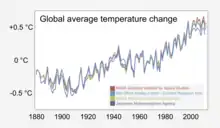 الوسيط|CitationClass=تم تجاهله (مساعدة) - "Warming of the climate system is unequivocal, as is now evident from observations of increases in global average air and ocean temperatures, widespread melting of snow and ice and rising global average sea level." IPCC, Synthesis Report, Section 1.1: Observations of climate change, in الإجماع العلمي حول التغير المناخي. نسخة محفوظة 04 أغسطس 2018 على موقع واي باك مشين.
