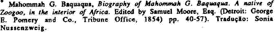 - توجد وثيقة مهمة لواحد من هؤلاء العبيد اسمه "محمد واقواقوا" وقد تم أسره من بنين، وسيق إلى البرازيل ثم نال حريته حينما ذهب لأمريكا[؟] على ظهر سفينة، وكان يجيد الكتابة، فقام بكتابة مذكراته بمساعدة أحد الأمريكان "صمويل مور" عام 1854م