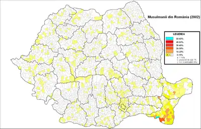 وفقاً لإحصاء عام 2002 السكاني، بلغ عدد المسلمين في رومانيا 67,566 نسمة، أي ما يعادل 0,3% من إجماليّ سكان البلاد.[1] الغالبية العظمى من المسلمين في رومانيا من أهل السنة والجماعة، الذين يتبعون المذهب الحنفي. عرقيًا، غالبية المسلمين من التتار (تتار القرم وعددٍ من النوغياس)، والأتراك، بالإضافة إلى المسلمين الرومان (حوالي 15,000 نسمة وفقاً للتقديرات)،[2] وكذلك الألبان (ما يصل إلى 3,000)،[3] وجماعاتٍ من المهاجرين من الشرق الأوسط والعالم العربي. يُطلَق على الأقلية المسلمة من الرومان أيضاً اسم "الرومان الأتراك". من ناحية العادات والتقاليد، يعتبر هؤلاء أقلَّ تديناً من أتباع المجتمعات الإسلامية الأخرى، وثقافتهم هي مزيجٌ من التقاليد الإسلامية والأعراف الاجتماعية الغجرية.