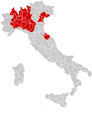 غطّت المنطقة المغلقة، اعتبارًا من 8 مارس عام 2020، إقليم لومبارديا بأكمله، بالإضافة إلى أربع عشرة مقاطعة في أقاليم بييمونتي، وفينيتو، وإميليا-رومانيا، وماركي. تضمنت المنطقة المغلقة مدينتي ميلانو والبندقية، وثلاث مناطق متفرقة (حول لومبارديا، وحول البندقية، ومنطقة أخرى تحيط بسان مارينو). يصل تعداد السكان في المنطقة المشمولة إلى أكثر من ستة عشر مليون شخص، أي ما يقارب ربع سكان إيطاليا.[23] غطّت المحاجر الصحية مساحةً تبلغ نحو 56,000 كيلومتر مربع (22,000 ميل مربع).[21]