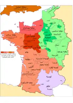 - اللغة: الفرنسية القديمة (الأكثر انتشاراً)، النورمندية (في نورماندي)، الإنجليزية الوسطى (في إنجلترا)، البشكنشية (في أقطانية)، الويلزية (في ويلز)، البرطانية (في برطانية)، اللاتينية (في الإدارة الحكومية والكنسية)، الإيرلندية الوسطى (في إيرلندا) وغيرها من اللغات.